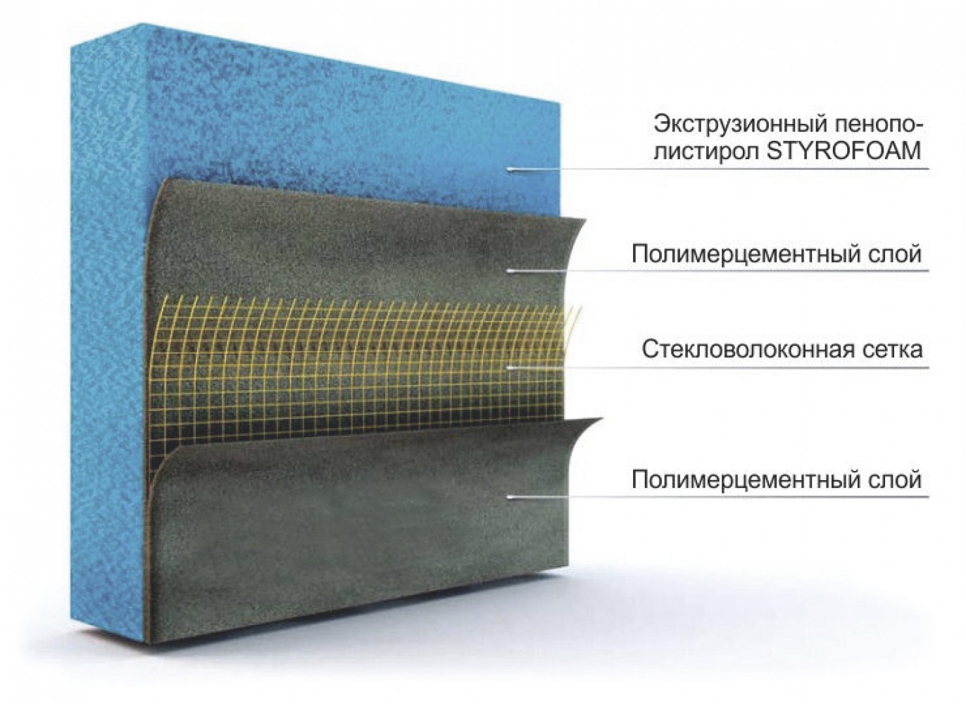 Теплоизоляционные панели TEPLOFOM+ имеют довольно сложную конструкцию. Лист экструдированного полистирола покрывается слоем полимерцемента. Затем панель армируется выполненной из стекловолокна сеткой. Полимерцементный слой делает поверхность листа более гладкой.