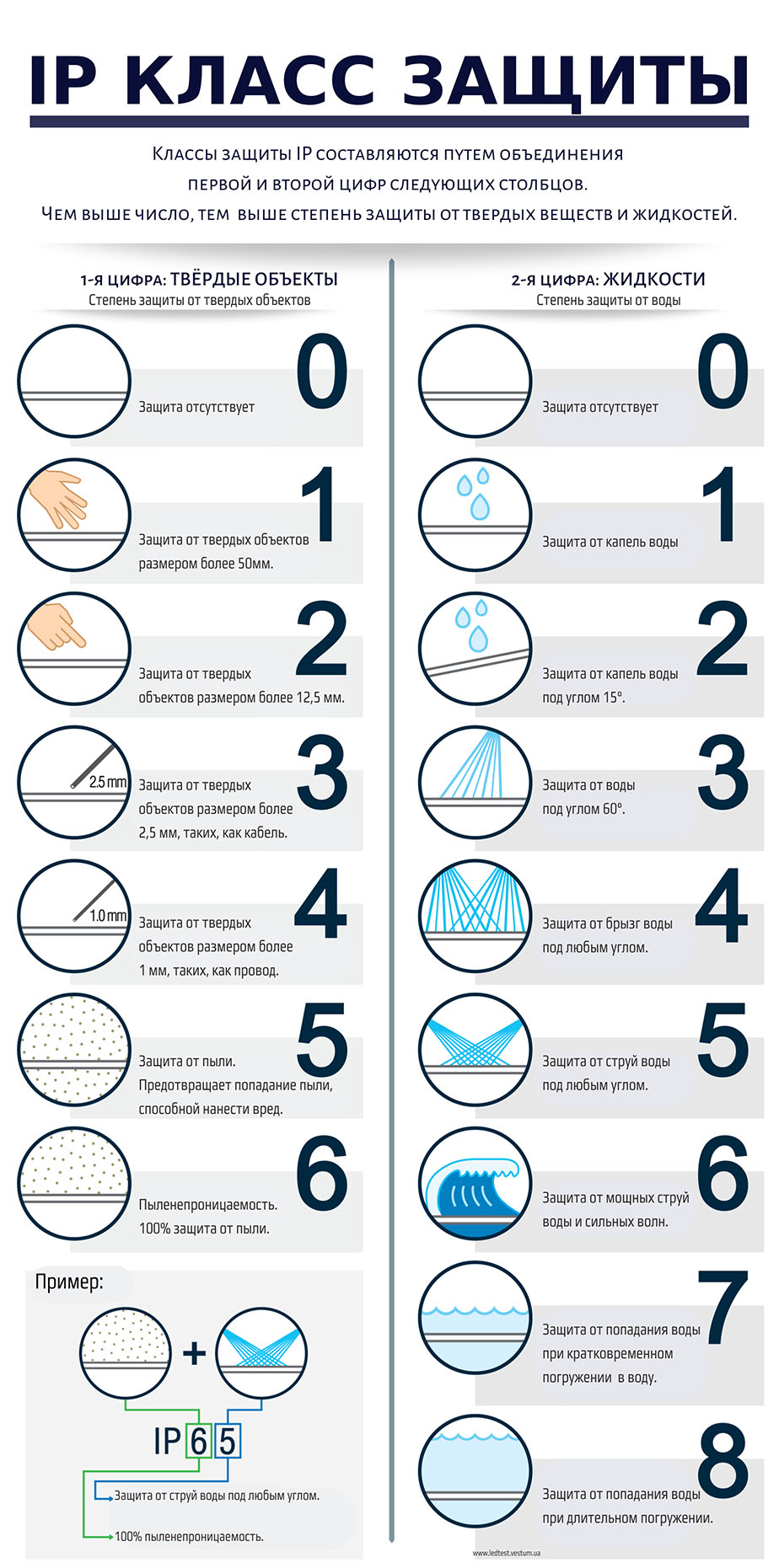 Запись состоит из двух цифр. Первая описывает защиту устройства от посторонних предметов, таких как пыль, вторая указывает на защиту устройства от воды.