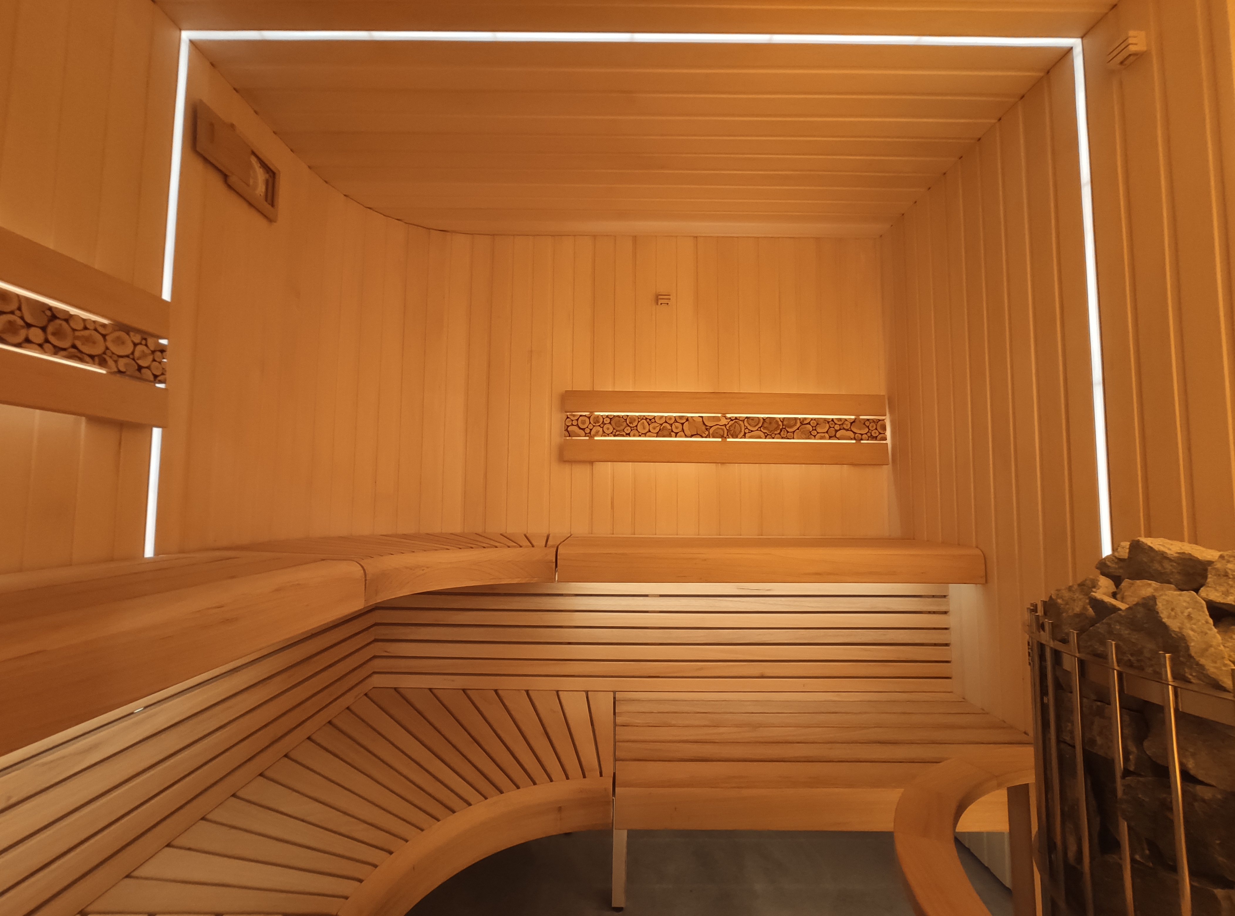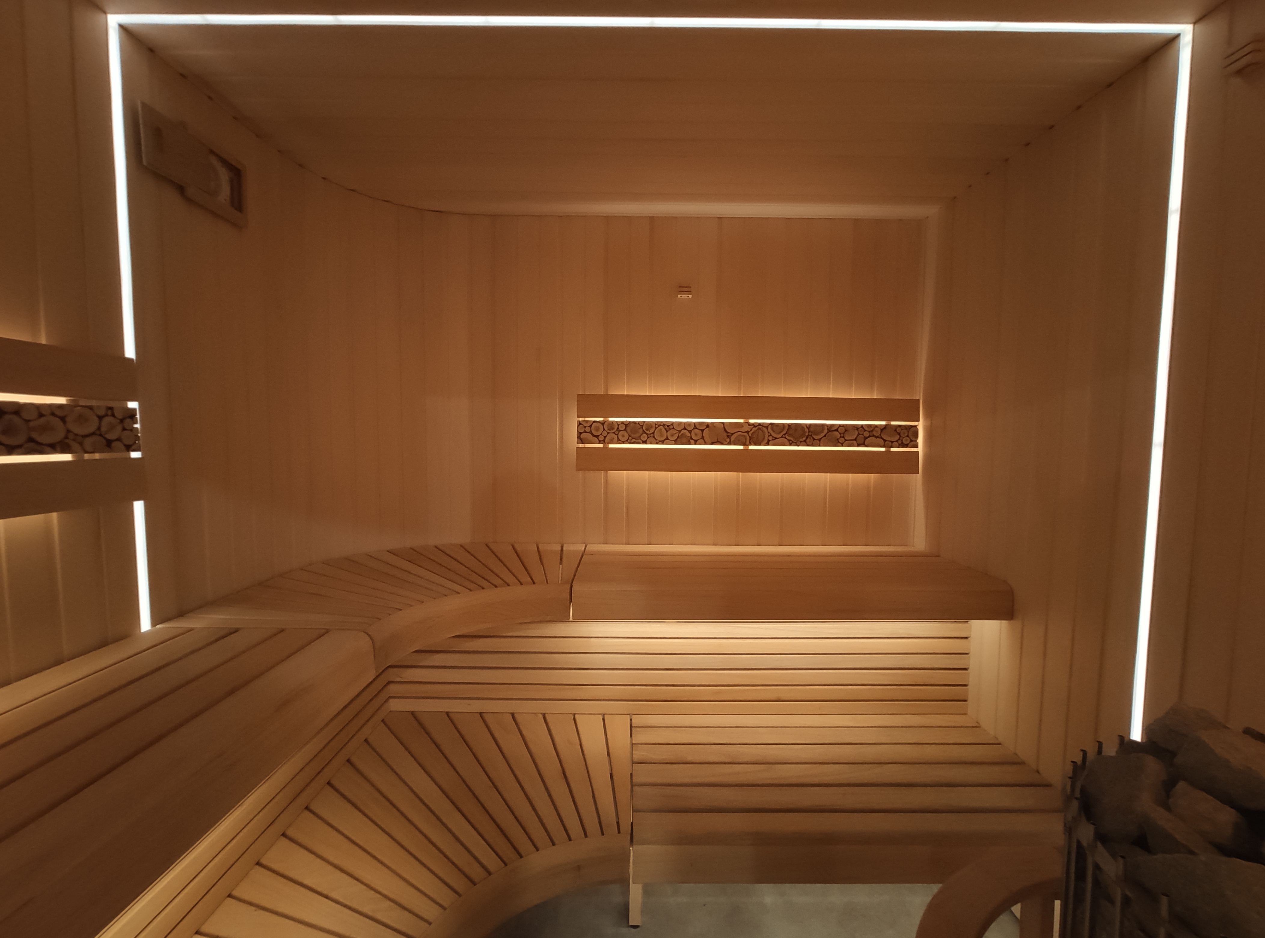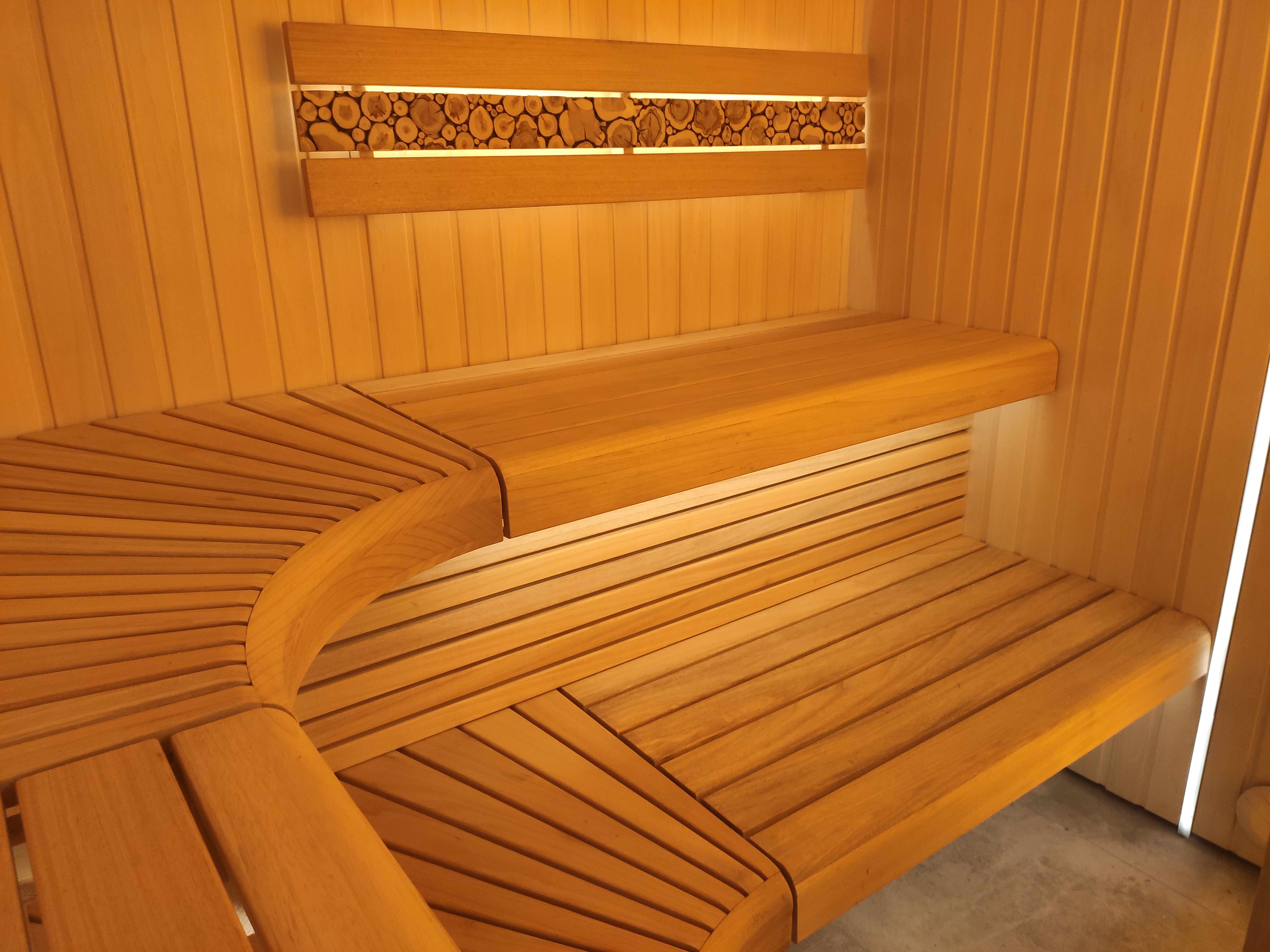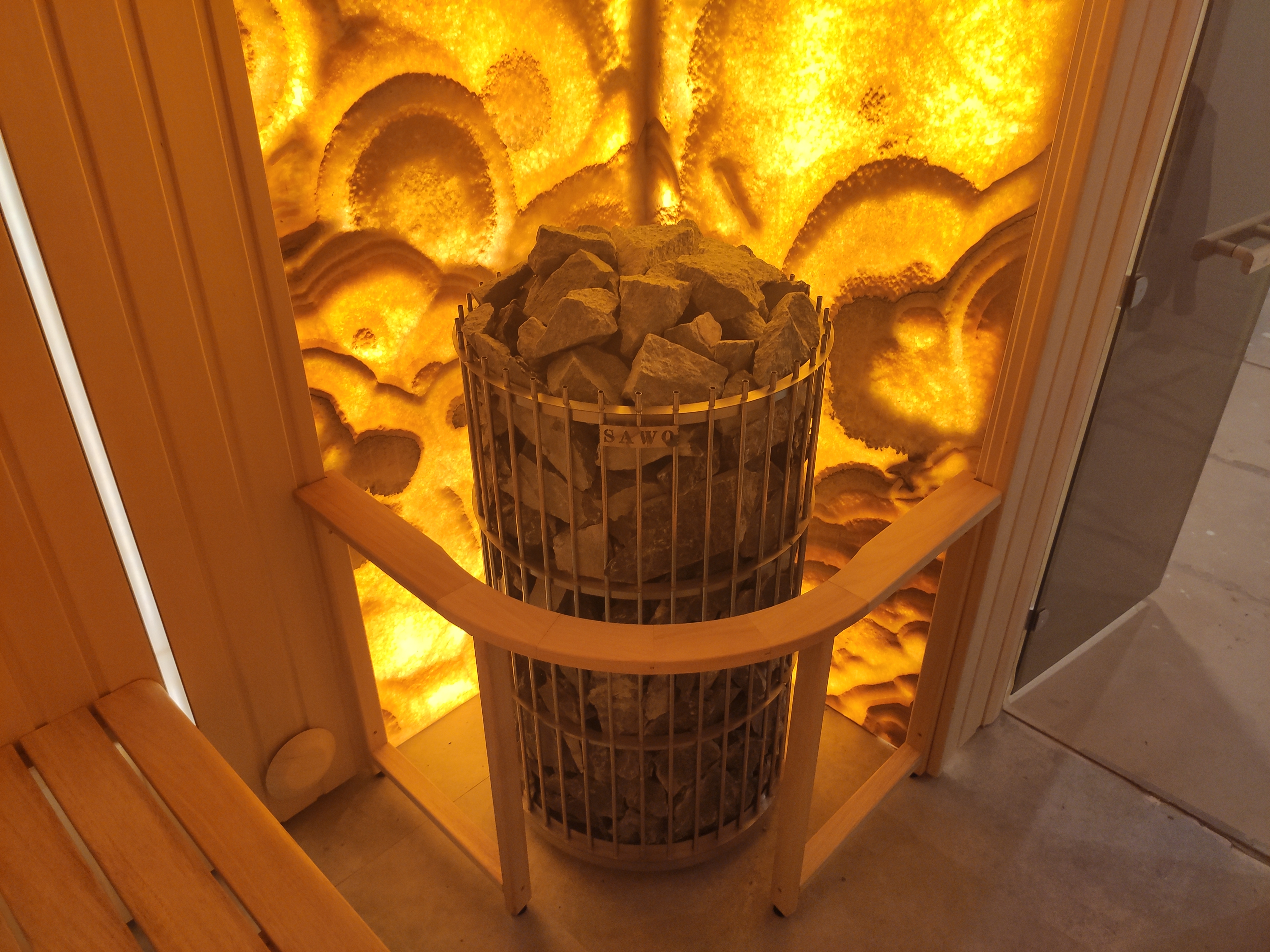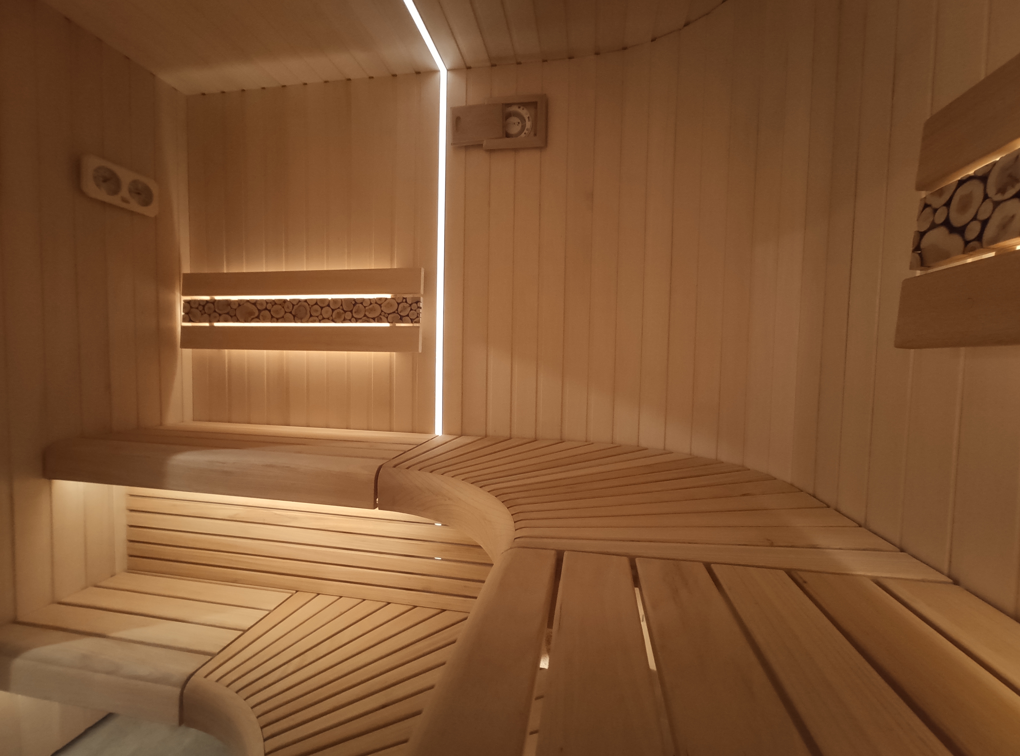 ✔️ материалы для отделки сауны (стены потолок - липа; панно из можжевельника; полок - абаш ; приточная и вытяжная система вентиляции, камень на стене за печью оникс , стеклянная дверь)